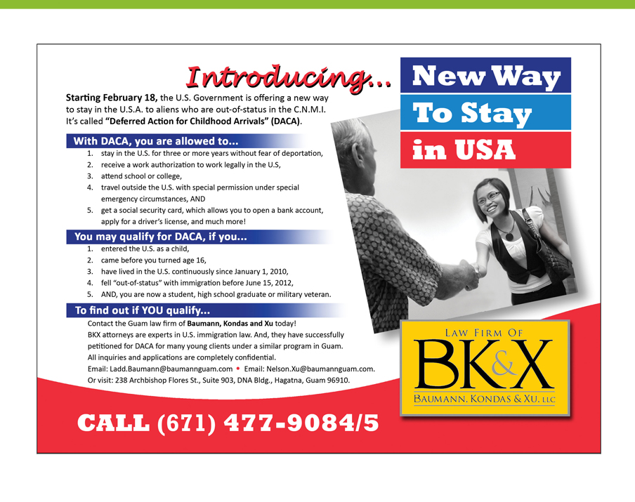 18 Feb 2015 BKX Ad About DACA Posted at 12:00 PM in Ads, English by admin Deferred Action for Children ArrivalsPublished in the Marianas Variety Saipan & Tribune February 18, 2015