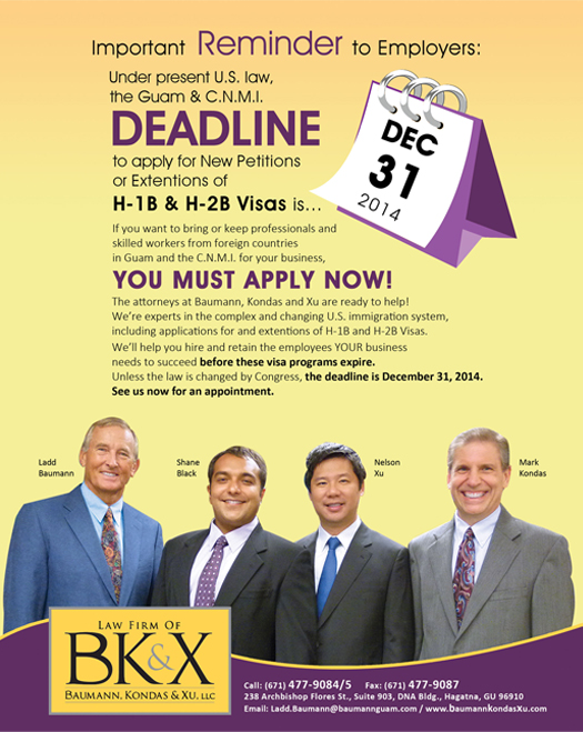 Under present U.S. law, the Guam & C.N.M.I., DEADLINE to apply for New Petitions or Extentions of H-IB & H-2B Visas is December 31, 2014!